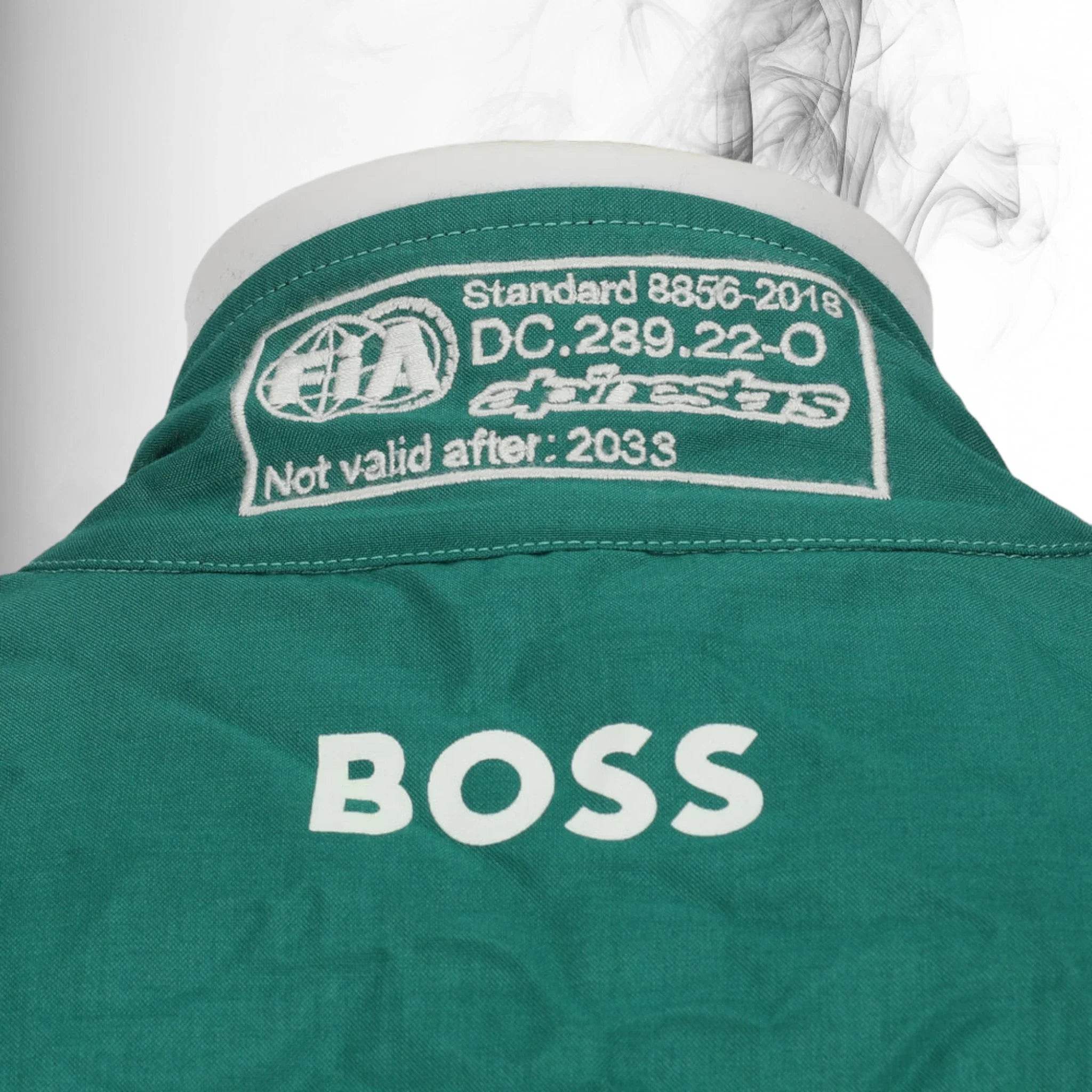 Your custom details will replace the original driver’s name, flag, and number in the same position on the suit.
